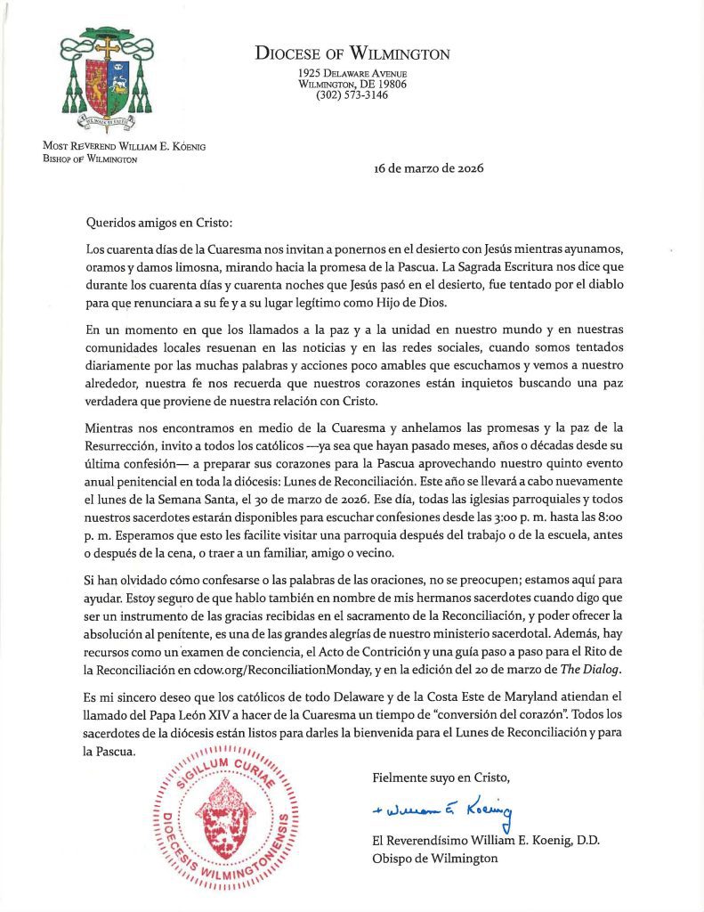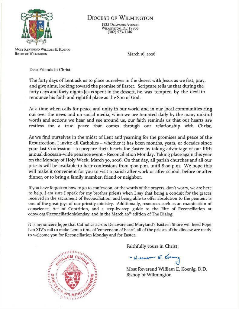 Our fifth annual Reconciliation Monday will take place on Monday, March 30 from 3 p.m. until 8 p.m. All parishes in the Delaware and Maryland’s Eastern Shore will be holding confessions. So, if it is more convenient for you to go to another church closer to work or school, feel free to do so. Please invite those friends and family members who have been away from the Sacraments to take advantage of this opportunity.