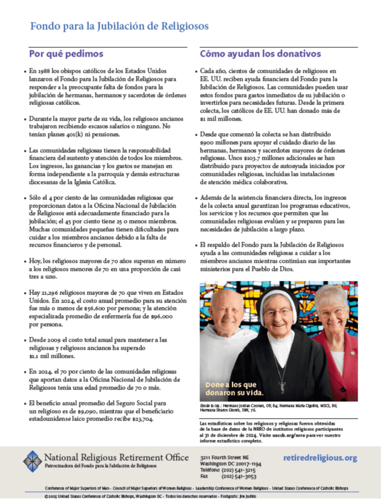 In 2024, the appeal raised over $28.1 million, providing financial assistance for the retirement needs of 266 U.S. religious communities. Beyond financial aid, the collection supports educational programs, empowering religious communities to plan for their long-term needs.