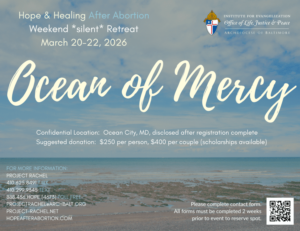 The Archdiocese of Baltimore is hosting a Weekend of Hope & Healing retreat in the Diocese of Wilmington – offering a beautiful opportunity to any woman or man who has struggled with the emotional or spiritual pain of an abortion. Information can be found on the CDOW website. A flyer is also attached.